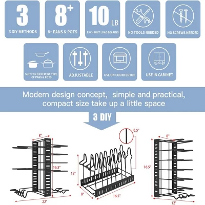 FURNIinspire 8-tier adjustable cookware rack simplifies pot and lid storage, keeping kitchens neat. Its tiers adjust to fit pots, pans, lids, cutting boards, or baking trays of all sizes, while dual stand-up/lie-down design fits cabinets, pantries, or drawers. Made of heavy-duty iron with a rust-resistant black finish, it’s sturdy and durable. It centralizes all cookware in one spot, saving space and eliminating clutter. Ideal for any kitchen, it’s a flexible, long-lasting for tidy cooking spaces.