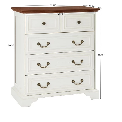 Elevate your home with this exquisitely crafted vintage-inspired dresser that marries antique charm with functional storage. Five spacious drawers offer organized storage for clothing and linens while the expansive top surface accommodates lamps, photos or decorative accents. The versatile woodgrain finish naturally enhances both contemporary and traditional spaces – equally stunning in bedrooms as statement furniture or in living areas as a console.