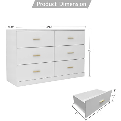 Upgrade your bedroom organization with this beautifully designed 6-drawer dresser that combines functional storage with modern elegance. The sophisticated design features refined accents that complement both contemporary and traditional decors, making it a versatile addition to your home. Six spacious drawers offer generous storage for folded clothing, bedding, and accessories while maintaining a streamlined silhouette.