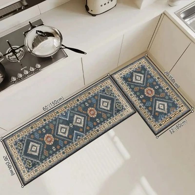 FURNIinspire Floor Mats Home 2 Piece Kitchen Rug Machine Washable Floor Mat For Living Room, Vintage Carpet, Non Slip, Blue, 60″*20″