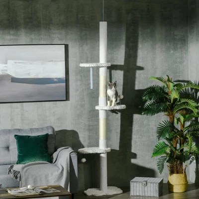 The FURNIinspire Floor to Ceiling Cat Tree maximizes vertical space, providing an engaging environment for your cat to climb and explore. With unique cloud-shaped platforms and cotton rope scratching posts, it promotes healthy scratching while protecting your furniture. The secure installation features an anti-toppling device for safety, and the cozy plush fleece cover offers a soft resting area for relaxation.