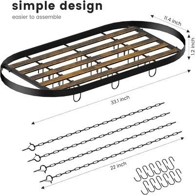 FURNIinspire oval hanging pan rack blends sturdiness and versatility—thick anti-rust metal with a black coating ensures durability, while a robust frame and chains provide reliable support. Ceiling-mounted, it saves cabinet/counter space and keeps cookware accessible. It works for kitchens or covered patios. The package includes a grid shelf, 12 hooks, ceiling hardware, screws, and a tool for assembly in under 5 minutes. Ideal for any home, it’s a practical, space-saving storage solution.