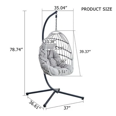 FURNIinspire Patio Swings Hanging Chair With Wicker Weave, Single Person Swing With Seat Cushion For Indoor And Outdoor, Gray, 37“*37″*79″